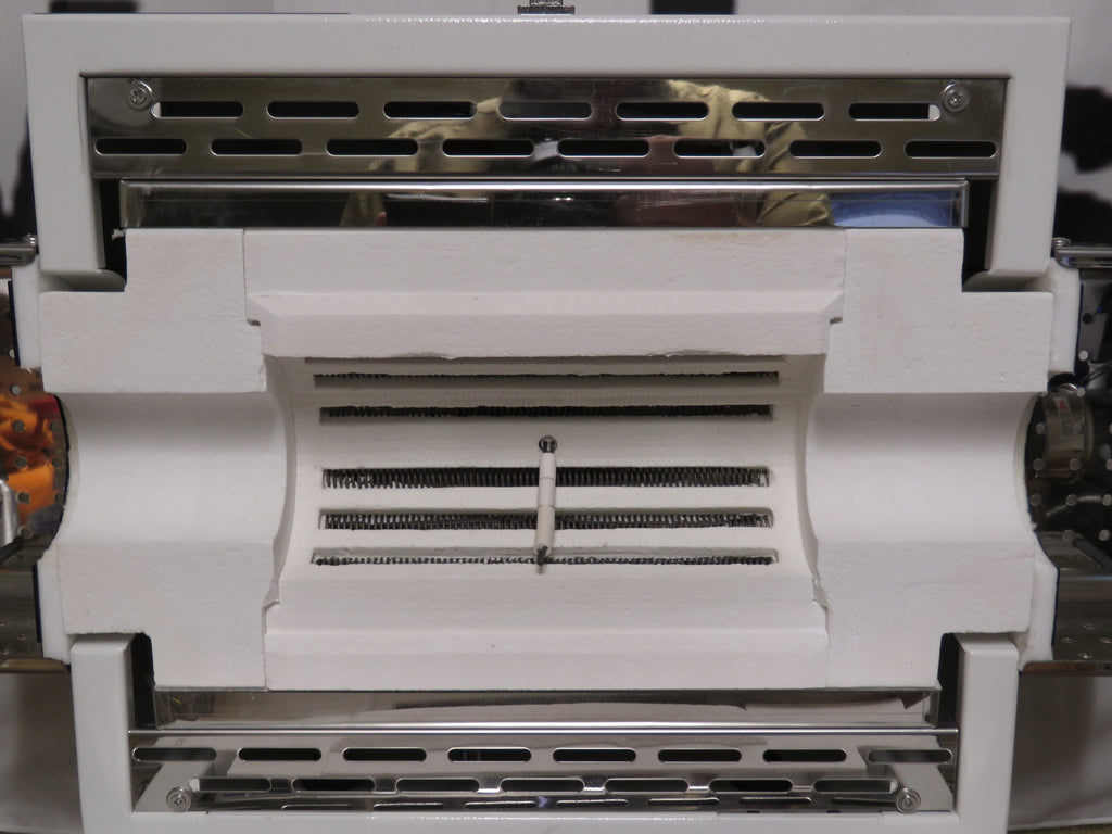 STF1200 50x600mm (ODxlength) portable top-open tube furnaces feature spiral wire coils embedded in Mitsubishi (Japan) alumina fiber insulation. A double walled steel internal housing helps minimize heat loss to exterior surface. Furnace operation is controlled by a 30-segment digital controller. All our furnaces are CE compliant.