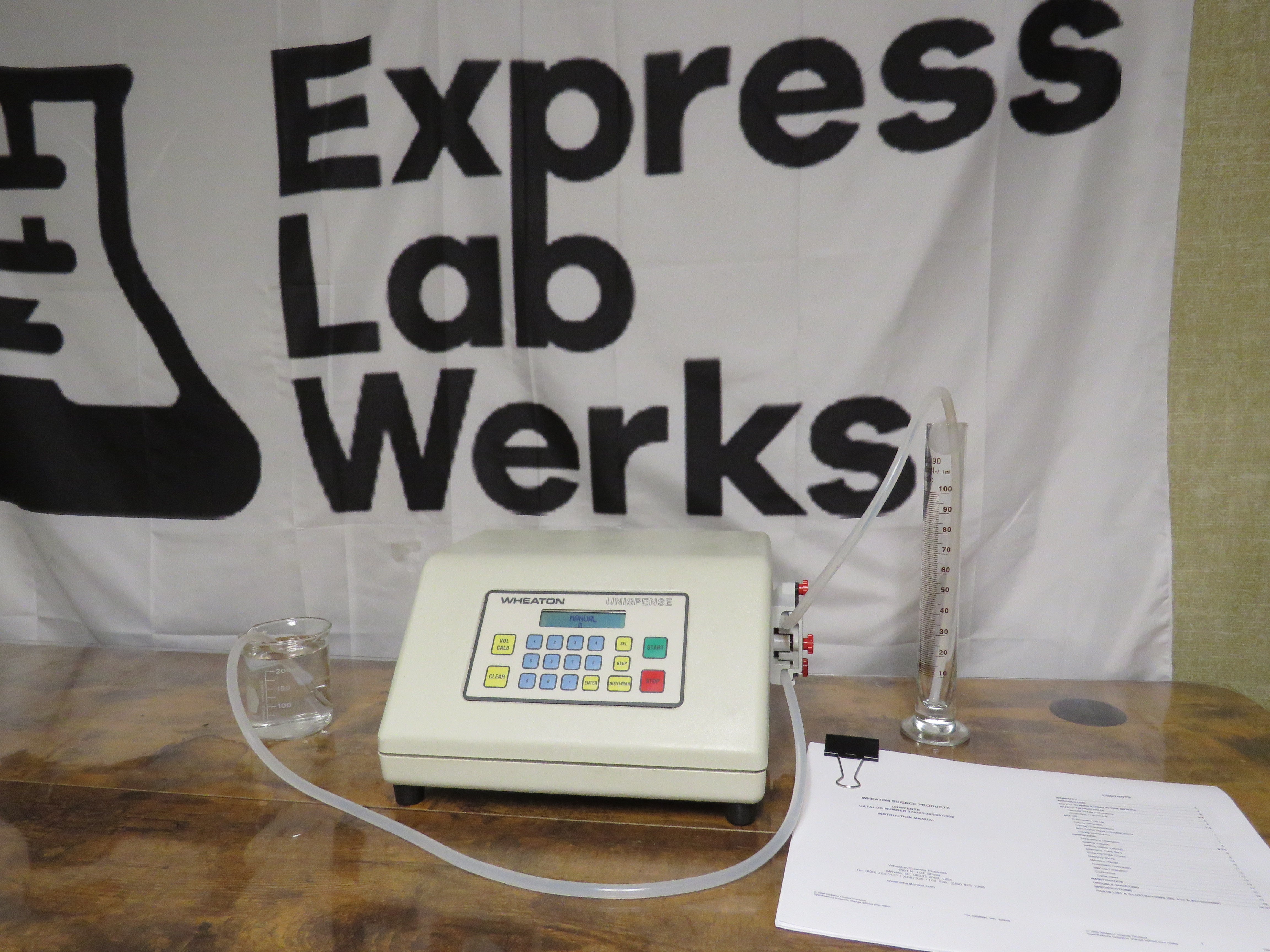 Excellent functional condition. Glassware and tubing in video is not included. Please note: This is the Mini pump head version of the Unispense pump which supports only 2mm tubing and offers a volume range of 0.20 to 150 mL per dose.